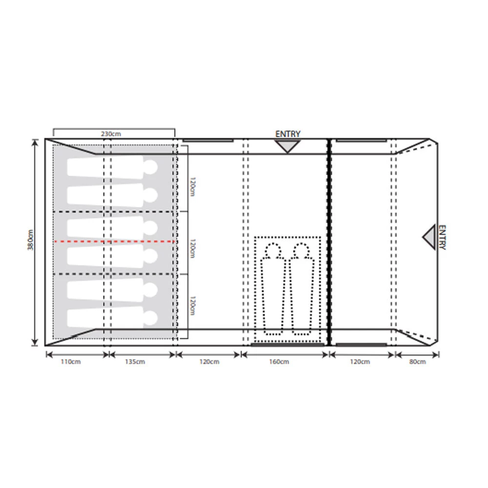 • 230cm deep, darkened twilight micro polyester 6-person bedrooms with a 2/2/2 zip in divider plus extra central toggle-in divider panel
