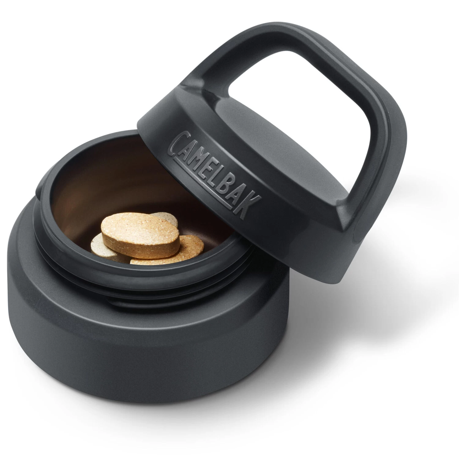 Top off your CamelBak water bottle with Pak Cap’s hidden hauling capability. Conveniently store snacks, vitamins, or any other small essentials in the top half of the twist-to-open cap. Leak-proof when closed and easy to clean. Compatible with MultiBev, Chute Mag, Eddy+, Carry Cap, and Hot Cap vessels. FEATURESStorage: Stow snacks or small essentialsLeak-free: Completely leak-proof when closedEasy to Carry: Comfortable carry handleEasy to Clean: Dishwasher safeDrink Clean: BPA, BPS, and BPF freeUniversal Cap: Compatible with MultiBev, Chute Mag, Eddy+, Carry Cap, and Hot Cap vessels