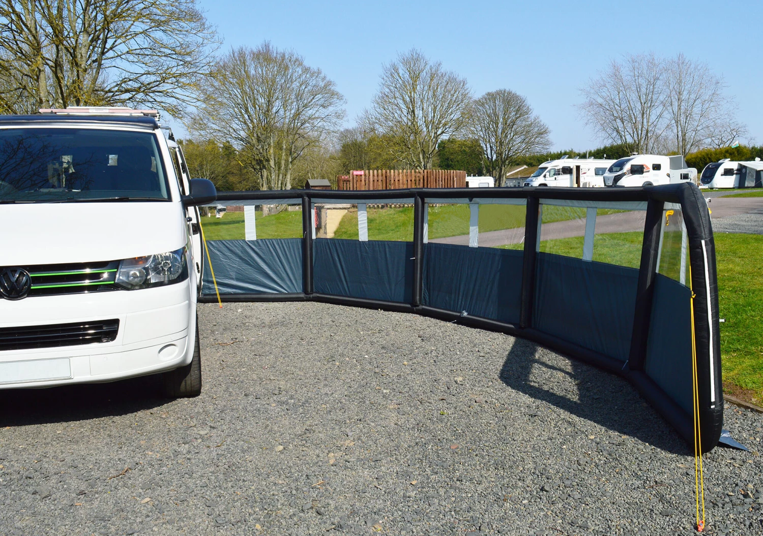 Maypole’s 5 panel single point inflation windbreak provides privacy and protection from the wind. The sturdy airframe is quick and easy to inflate via a single point air tube. The windbreak includes removable window covers for added privacy, and midway pegging points to keep your pets safely inside. Kadar strips on either end allow for caravan awning rail attachment, giving you extra stability. Hand pump, guy ropes, pegs and a compact carry bag are all included.