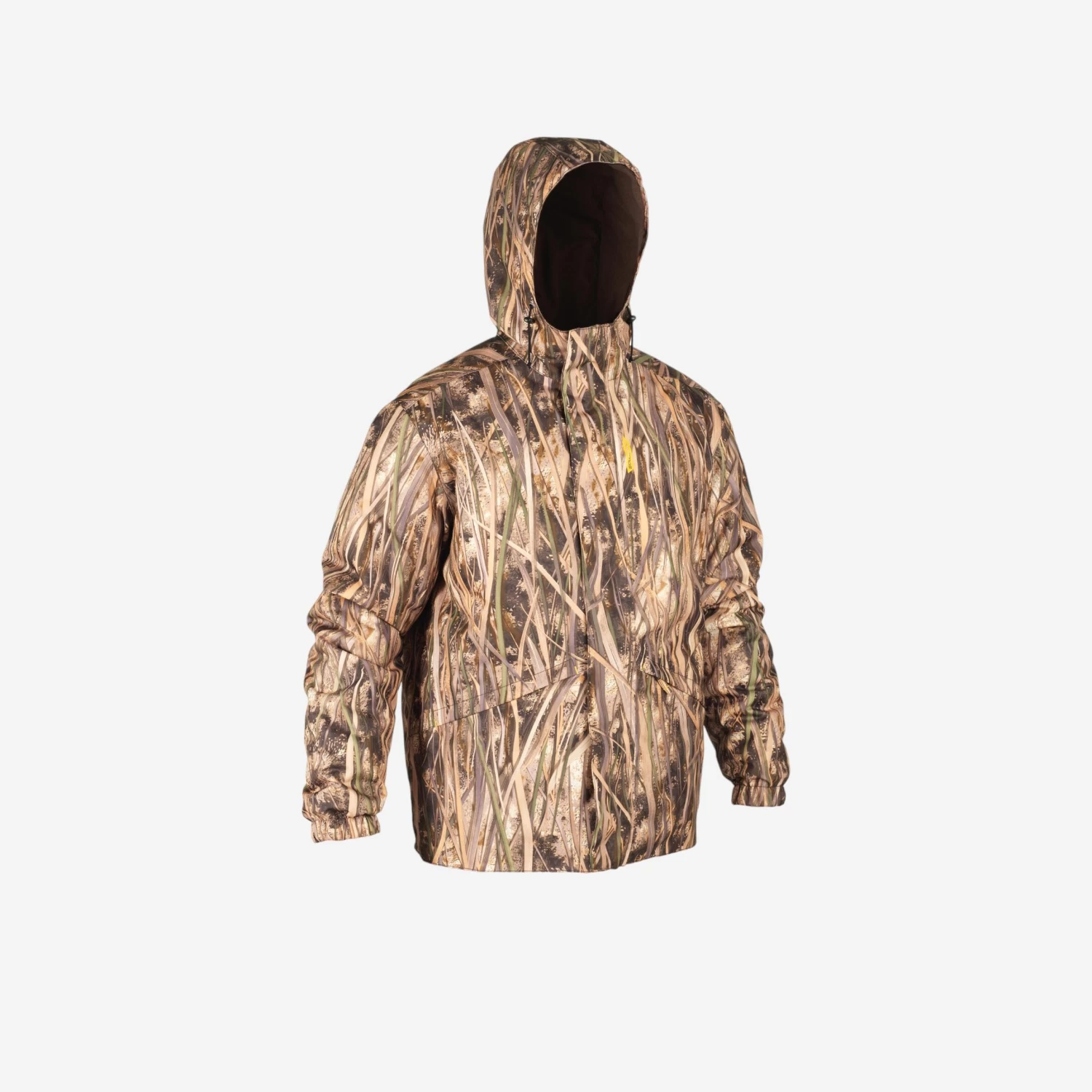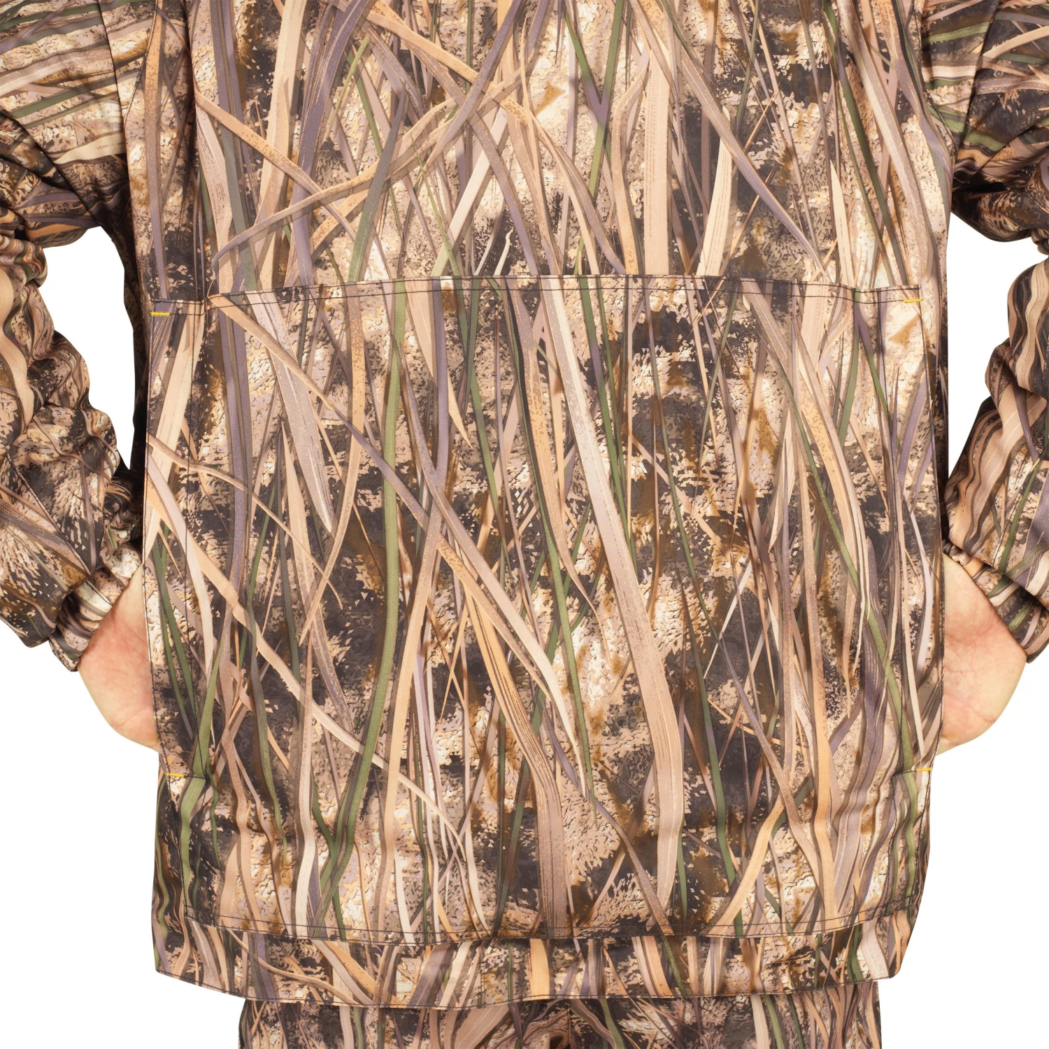 This hunting jacket has the exclusive SOLOGNAC wetlands camouflage pattern, designed for better camouflage in the eyes of waterfowl such as geese, ducks and teals. With its ultra-realistic pattern of vegetation (rush, grass, reeds), a distinct 3D effect, a realistic foreground and a background with contrasting light and dark shades, this jacket lets you blend into any type of undergrowth, by day and at dusk.