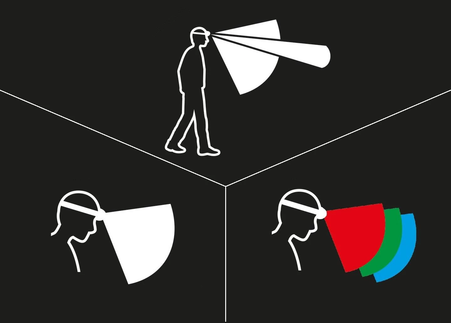 Waterproof, robust, and powerful headlamp with white, red, green, and blue lighting, ideal for exploring nature at night. 450 lumens
